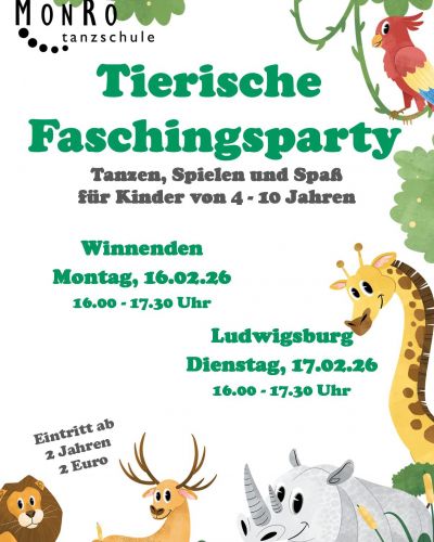 Fasching Wir machen vom 16.02. bis einschließlich 22.02. Faschingsferien-in dieser Zeit finden keine regulären Kurse und Gruppen statt. Allerdings werden verschiedene Workshops und eine Faschingsparty für Kinder angeboten: Rosenmontag, 16.02.26 in Winnenden. Eine tierische Party mit tanzen, S…