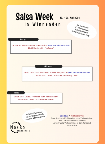 MonRo ist aber nicht nur der regelmäßige Tanzkreis sondern auch zahlreiche Events. Waren es in der Vergangenheit Wochenend-Workshops, anstrengend aber erlebnisreich, oder auch R(h)ein in Weiß, die Tanzfahrt auf dem Rhein, sind es jetzt die Salsa Live – Abende mit südamerikanischen Combos im großen Saal der Tanzschule, der dann bebt und uns kubanische Atmosphäre erleben lässt.